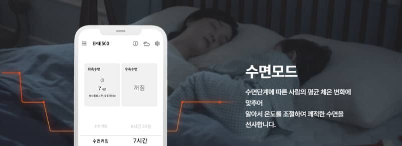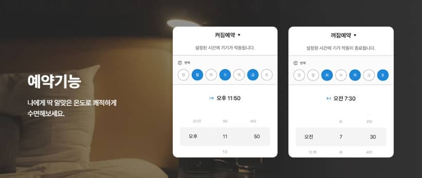 예약 기능과 수면 모드, 원격 제어 기능을 통해 언제 어디서나 나의 쾌적한 수면을 관리할 수 있습니다.