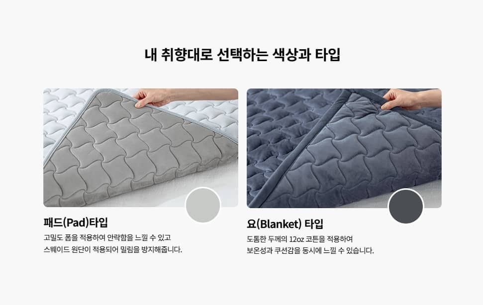 모던한 디자인과 손가락 하나로 좌우 온도를 조절할 수 있는 조그다이얼로 심플하고 편리한 조작이 가능합니다. 고급 극세사 원단이 주는 부드러운 촉감은 물론, 여러 색상과 타입으로 나만의 취향에 맞출 수 있습니다.
