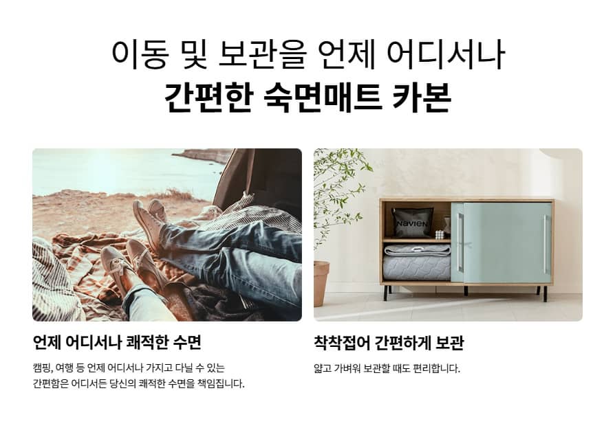경동나비엔 카본 매트는 언제 어디서나 쾌적한 수면을 책임집니다. 캠핑 이불처럼 간편하게 이동 가능하며, 보관할 때도 얇고 가벼워 편리합니다.